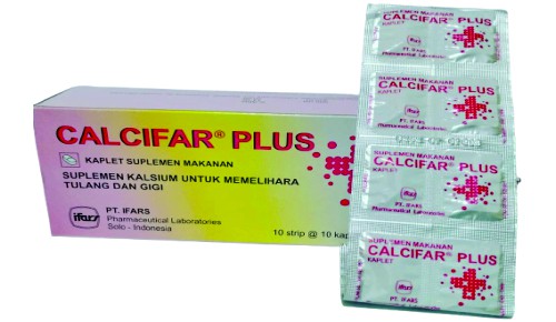 Calcifar Plus merupakan suplemen yang berfungsi untuk memelihara kesehatan tulang dan gigi, mempercepat penyerapan kalsium dalam tubuh, mencegah risiko pengapuran tulang, membantu proses pertumbuhan anak. Calcifar Plus memiliki kandungan Calcium hydrogen phosphate dihydrate 500 mg, vitamin D3 200 IU. Calcifar plus bekerja berdasarkan kedua kandungan aktif utamanya, kalsium hidrogen phospat dihidrat dan vitamin D3. Kedua zat ini berperan dalam metabolisme kalsium yang menjadi penyusun utama tulang dan gigi serta berperan penting pada banyak fungsi tubuh. Kalsium berperan penting dalam fungsi sel, saraf, otot dan tulang. Jika tidak ada cukup kalsium dalam darah maka tubuh akan mengambil kalsium dari tulang, sehingga melemahkan tulang. Sementara vitamin D3 membantu penyerapan kalsium dan phospor, mencukupi asupaannya akan sangat bermanfaat untuk kesehatan tulang. Obat ini termasuk golongan vitamin & suplemen yang bisa didapat tanpa resep dokter.