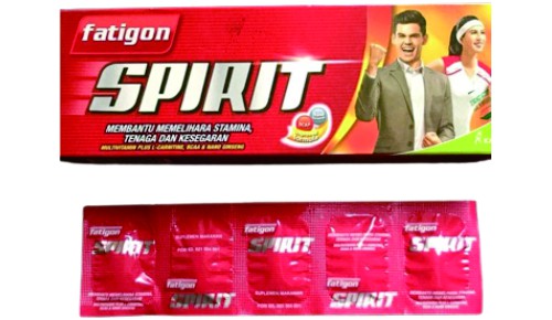 Fatigon Spirit merupakan suplemen yang berfungsi untuk mencegah dan mengobati kekurangan vitamin B1, B6, dan B12, membantu proses metabolisme tubuh untuk menghasilkan energi, membantu memelihara stamina tubuh, membantu menambah kesegaran tubuh dalam melakukan aktivitas sehari-hari, serta memelihara kesehatan saat bekerja maupun berolahraga. Fatigon Spirit memiliki kandungan L-Carnitine 100 mg, BCAA 40 mg, Nano Ginseng Extract 10 mg, Vitamin B1 10 mg, Vitamin B6 5 mg, Vitamin B12 5 mcg, Guaranine 50 mg. Fatigon Spirit mengandung vitamin B kompleks yang membantu memelihara kesehatan sistem metabolisme tubuh, memperbaiki fungsi sistem saraf, serta membantu peredaran oksigen di dalam sel tubuh. Vitamin B1 berperan dalam membantu metabolisme karbohidrat serta menjadi koenzim pada dekarboksilasi asam alfa-keto. Vitamin B6 membantu metabolisme asam amino dan protein karena bisa berubah menjadi piridoksamin fosfat dan piridoksal fosfat. Vitamin B12 membantu memelihara intergrasi jaringan saraf, memiki peran dalam sintesa asam nukleat serta berpengaruh pada pemotongan sel. L-carnitin: merupakan turunan asam amino yang kerap digunakan sebagai penurun berat badan. Senyawa ini dibutuhkan dalam pembakaran asam lemak menjadi energi dalam tingkatan sel. L-carnitin juga dapat bermanfaat untuk otak, kesehatan jantung dan peningkatan kemampuan dalam berolahraga. Ginseng ekstrak: tanaman herbal dari cina ini sudah dikenal sejak lama akan beragam khasiatnya. Mulai dari menghilangkan lelah tubuh, sebagai antioksidan, hingga membantu meningkatkan sistem imun, serta menurunkan gula darah. Guaranin: senyawa yang diekstrak dari buah guarana ini merupakan senyawa kimia yang karakteristiknya sama dengan kafein. Guaranin dapat digunakan untuk meningkatkan detak jantung yang membuat lebih terjaga, menunda kantuk dan lapar, namun efeknya juga dapat meningkatkan pengeluaran urin seperti kafein. BCAA: merupakan asam lemak esensial dengan karakteristik memiliki ikatan cabang (branched-chain), asam amino ini diantaranya adalah leucin, isoleucin, dan valine. Senyawa-senyawa tersebut bermanfaat untuk meningkatkan pertumbuhan otot, meringankan nyeri otot setelah lelah beraktivitas, dan meredakan kram. Selain itu, BCAA juga diketahui baik untuk penderita penyakit hati. Obat ini termasuk golongan vitamin & suplemen yang bisa didapat tanpa resep dokter.