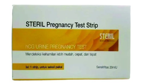 Steril Pregnancy Test Strip merupakan alat tes kehamilan berbentuk strip yang dapat memberikan informasi positif hamil atau tidak dengan cepat, akurat (99,9% keakuratan) dan pribadi. Hasil tes sangatlah cepat, mudah dan dapat dilakukan kapan saja. Pemakai hanya cukup mencelupkan strip tersebut kedalam contoh air seni selama 30 detik. Hanya dalam waktu 1 hingga 3 menit, strip akan menghasilkan 2 garis jika Anda hamil dan 1 garis jika Anda tidak hamil. Alat test pack bekerja dengan cara mendeteksi keberadaan hormon human chorionic (hCG) dalam air seni atau urine. Hormon ini hanya ada jika sel telur yang telah dibuahi menempel di dinding rahim. Kadarnya pun akan meningkat seiring bertambahnya usia kehamilan. Strip Uji Kehamilan ini sudah dapat digunakan 7 hari setelah berhubungan.