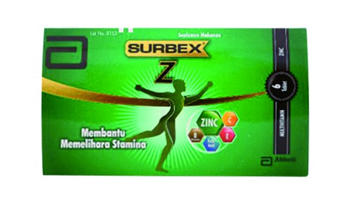 Surbex Z merupakan suplemen yang mengandung multivitamin yang berfungsi untuk memelihara daya tahan tubuh, serta dapat membantu menjaga stamina dan memelihara kesehatan. Surbex Z memiliki kandungan Vitamin C 750 mg, Vitamin B1 14,5 mg, Vitamin B2 15 mg, Niasinamida 100 mg,Vitamin B6 20 mg, Vitamin B12 12 mcg, Vitamin E 30 IU, Asam Pantotenat 20 mg., Asam Folat 400 mcg, dan Seng 22,5 mg.